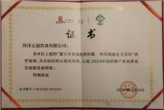 多年來(lái),公司載譽(yù)無(wú)數(shù),先后榮獲“2016年度山東省集體配餐優(yōu)秀單位”、“2017年度中國(guó)團(tuán)餐優(yōu)秀企業(yè)”、“全國(guó)企業(yè)信用評(píng)價(jià)AAA級(jí)信用企業(yè)”、“2017年度山東團(tuán)餐優(yōu)秀企業(yè)”、“2018年度山東團(tuán)餐十大優(yōu)秀管理企業(yè)”、“2019年度山東團(tuán)餐品牌二十強(qiáng)”、“2021年度山東團(tuán)餐品牌二十強(qiáng)”、“2021年度山東團(tuán)餐食育先行單位”、“2021年度中國(guó)團(tuán)餐服務(wù)質(zhì)量?jī)?yōu)秀企業(yè)”、“2022年度中國(guó)團(tuán)餐企業(yè)TOP100”、“2022年度團(tuán)餐領(lǐng)跑者TOP300”、“2022年度山東團(tuán)餐品牌TOP20”、“2022年度中國(guó)校園餐服務(wù)質(zhì)量百?gòu)?qiáng)企業(yè)”、“2023年度山東團(tuán)餐鄉(xiāng)村振興樣板企業(yè)”、“山東知名品牌”、“2023年餐飲企業(yè)示范單位”、“2023年度團(tuán)餐領(lǐng)跑者”、“曹縣2023年度放心消費(fèi)示范單位”、“2024年度山東省食育工作先行單位”“山東省食育工作服務(wù)站”、“2024團(tuán)餐服務(wù)百?gòu)?qiáng)企業(yè)”、“2024年度山東團(tuán)餐質(zhì)量發(fā)展企業(yè)”、“2024年度團(tuán)餐企業(yè)領(lǐng)跑者TOP300”等榮譽(yù)稱(chēng)號(hào)。這些榮譽(yù)不僅是對(duì)公司過(guò)往成績(jī)的肯定,更是激勵(lì)公司不斷前進(jìn)、持續(xù)提升服務(wù)品質(zhì)的動(dòng)力源泉。